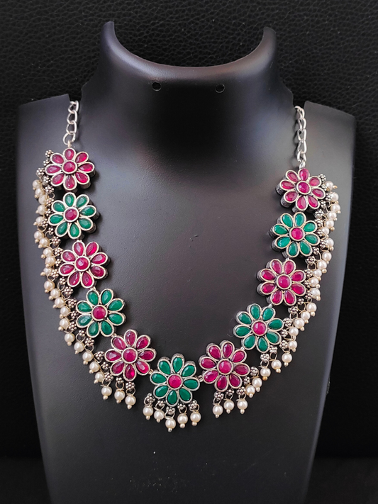 Ruby Red and Green Stone Oxidised Silver Choker Necklace Set