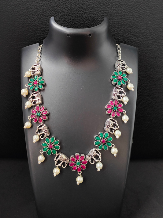 Ruby Red and Green Flower and Elephant Shaped Oxidised Silver Necklace