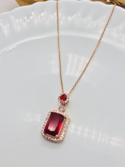 Ruby Red Rectangular Pendant Rose Gold Chain Necklace