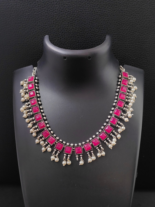 Ruby Red Square Stone Oxidised Silver Choker Necklace Set