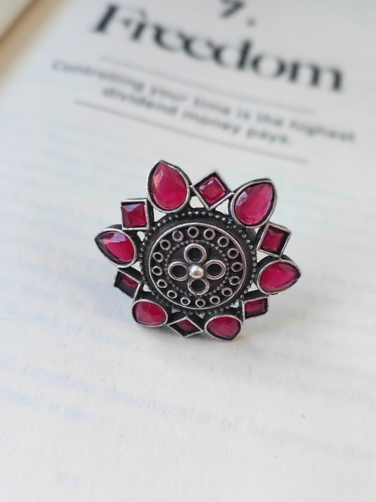 Ruby Red Stone Flower Shaped German Silver Oxidised Big Ring