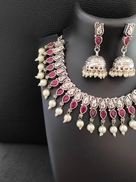 Ruby Red Stone Oxidised Silver Choker Necklace Set with Earrings