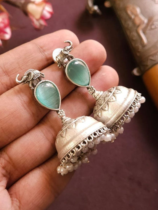 Sea Green Monalisa Stone Elephant Big Jhumka Earrings