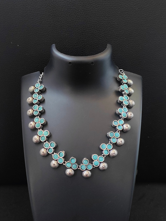 Sea Green Flower Shaped Oxidised Silver Necklace Set