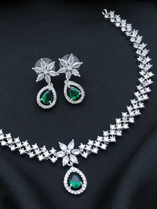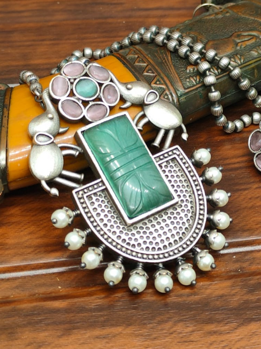 Sea Green Stone Floral Style Oxidised Silver Necklace Set