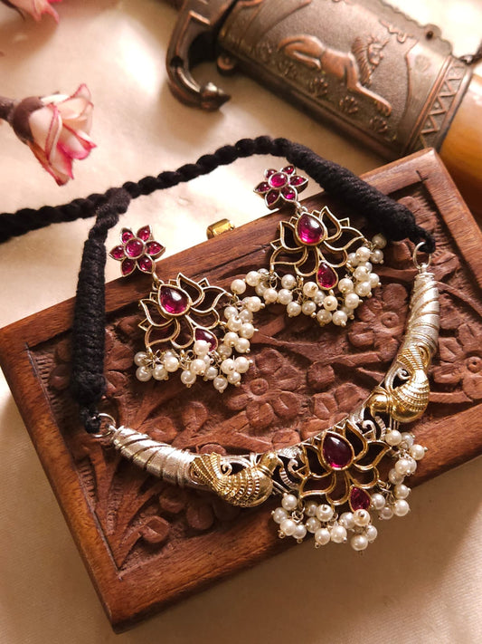 Rani Pink Stone German Silver Oxidised Necklace Set