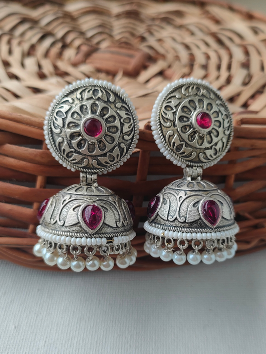 Rani Pink Stone German Silver Oxidised Jhumka Earrings