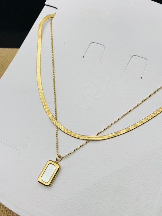 Rectangular Pearl Pendant Double Chain Golden Necklace
