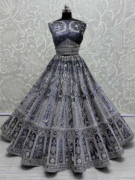 Dark Blue Thread Work Velvet Bridal Wedding Lehenga Choli