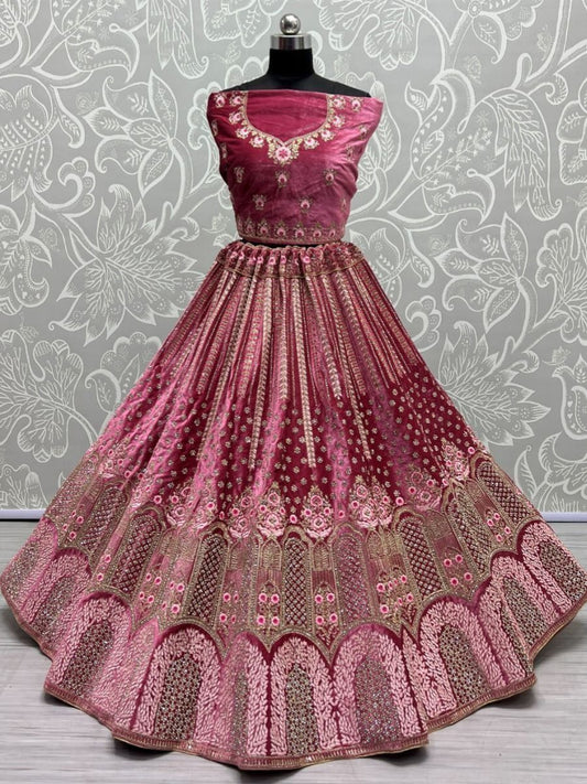 Designer Pink Thread Work Velvet Bridal Wear Lehenga Choli