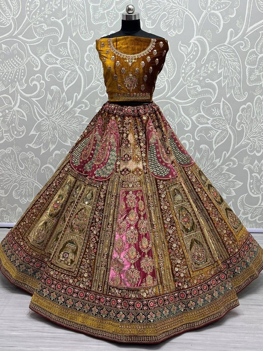 Mustard Yellow Thread Work Bridal Velvet Lehenga Choli