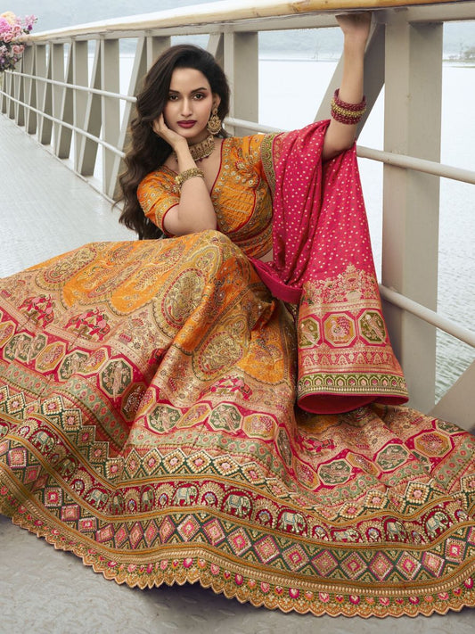 Orange and Red Embroidered Wedding Banarasoi Silk Lehenga Choli