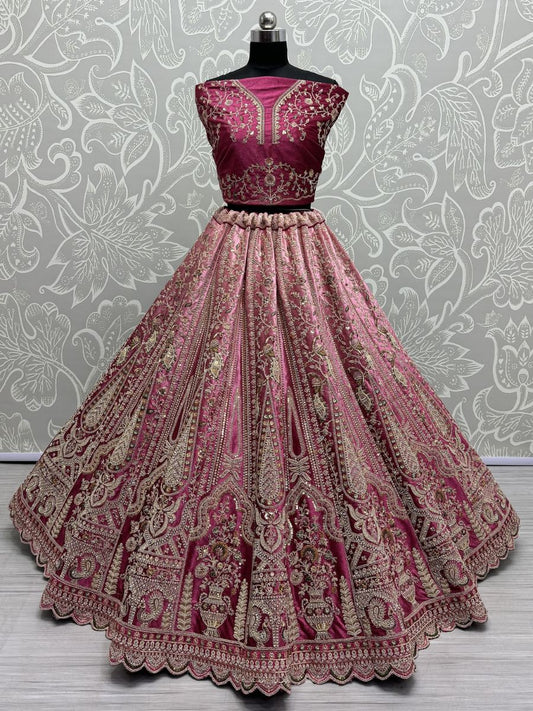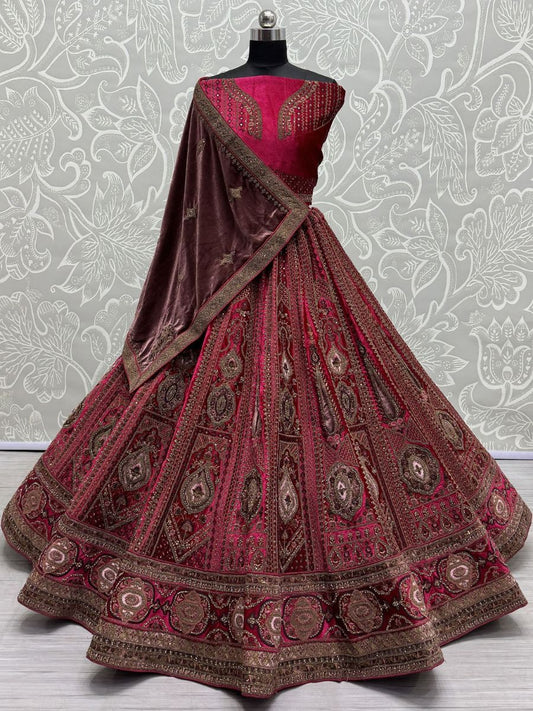 Pink and Wine Embroidered Bridal Velvet Lehenga Choli