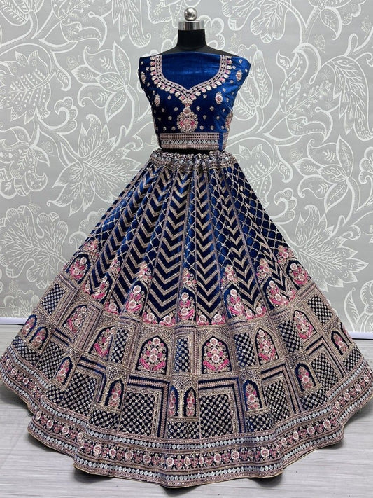 Royal Blue Thread Work Velvet Bridal Wedding Lehenga Choli
