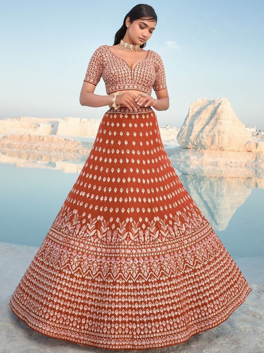 Rust Orange Sequins Work Georgette Wedding Lehenga Choli