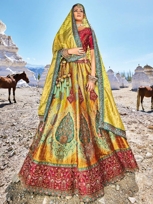 Red and Yellow Zari Work Jacquard Silk Bridal Lehenga Choli