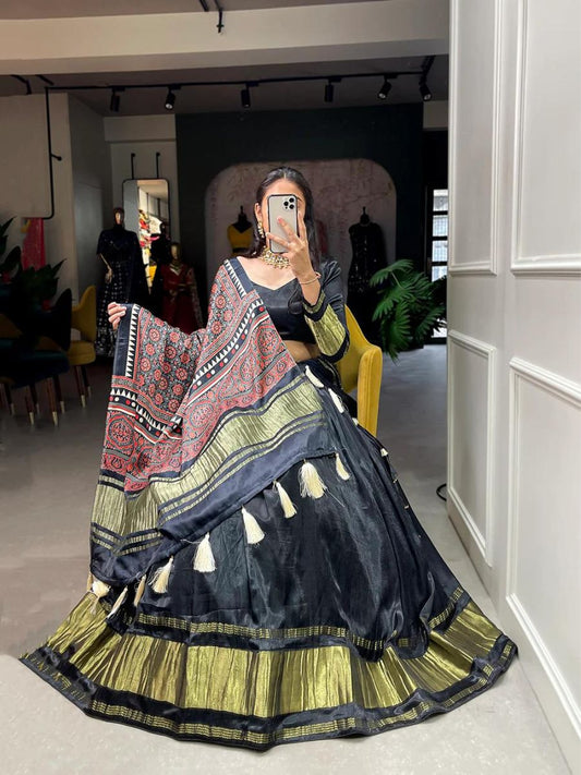 Plain Black Gaji Silk Lehenga Choli with Ajrakh Printed Dupatta