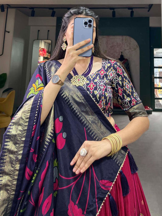 Rani Pink and Blue Foil Work Tussar Silk Navratri Lehenga Choli