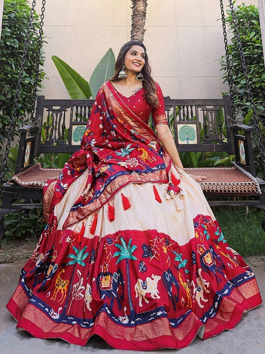 Designer Off White and Red Patola Printed Silk Lehenga Choli