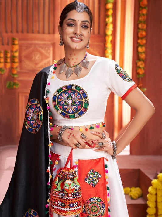 Traditional White Art Silk Navratri Chaniya Choli with Black Dupatta