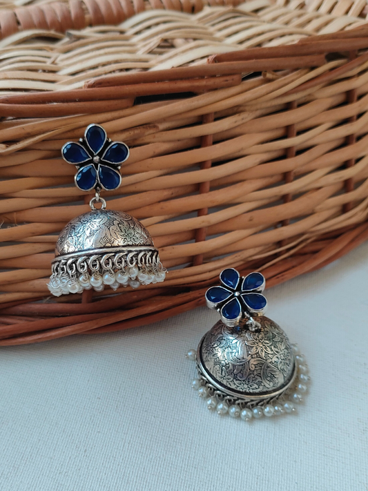 Blue Flower Shaped Silver Lookalike Oxidised Pearl Jhumka Earrings