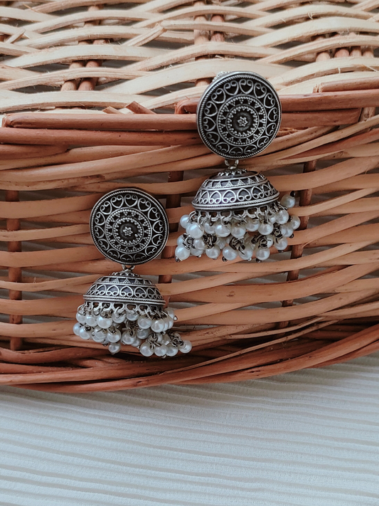 Classic German Silver Oxidised Jhumka Earrings with Pearls