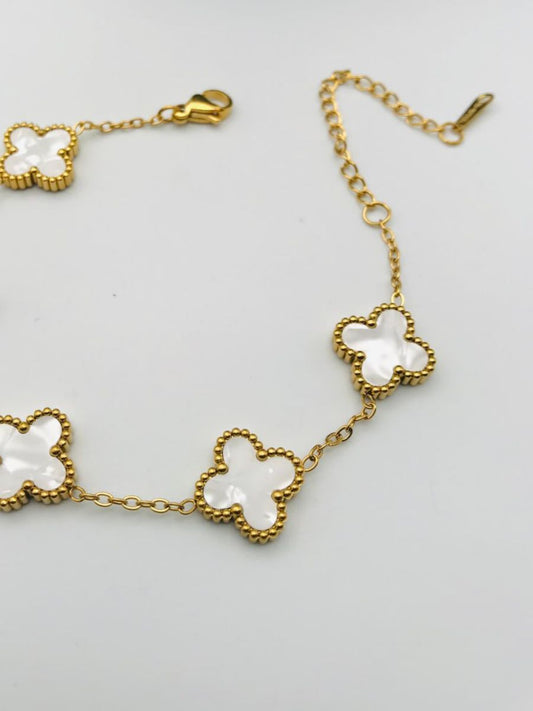 Five of White Pearl Enamelled Clover Charms Golden Bracelet