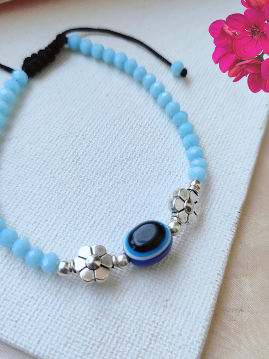 Floral Charm Sky Blue Beaded Evil Eye Anklet