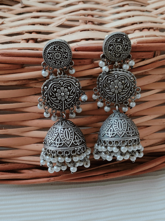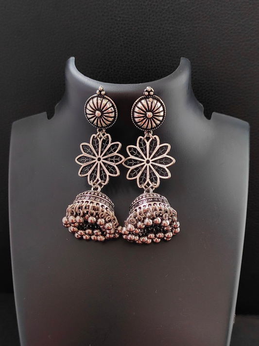 Floral Pattern Big German Silver Oxidised Jhumka Earrings