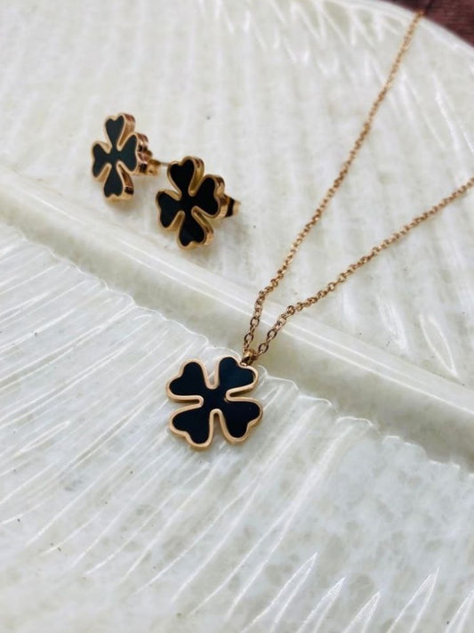 Four Leaf Black Floral Pendant Rose Gold Chain with Earrings