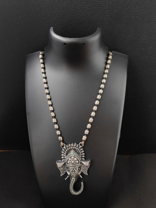 Ganesha Style German Silver Oxidised Long Necklace with Earrings