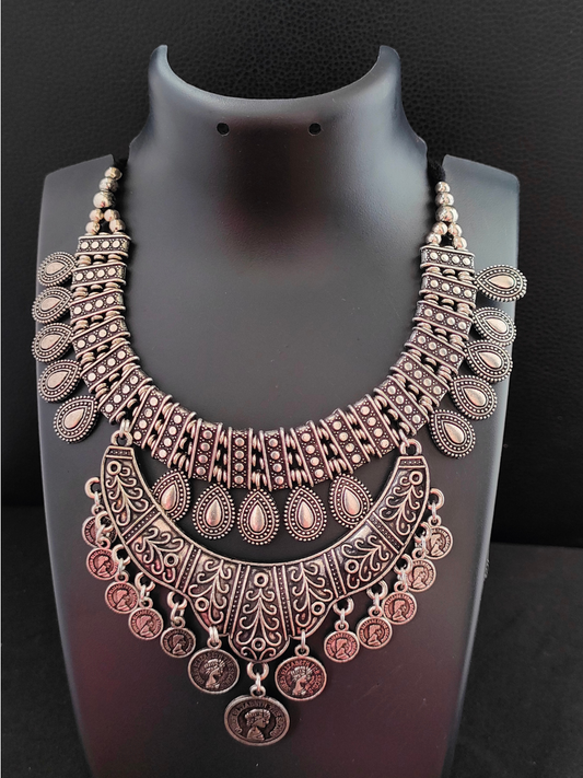 Ginni Coin Inspired Double Layer Oxidised Silver Necklace Set