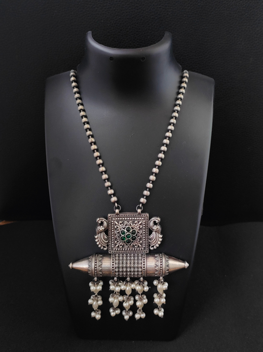Green Stone Big German Silver Oxidised Pendant Necklace Set