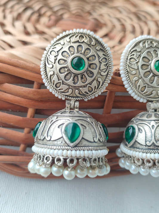 Green Flower Shaped Silver Lookalike Oxidised Pearl Jhumka Earrings